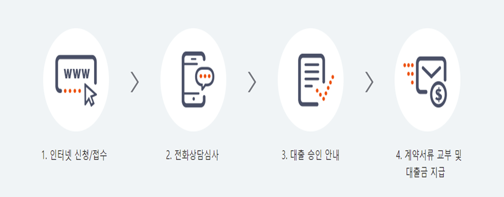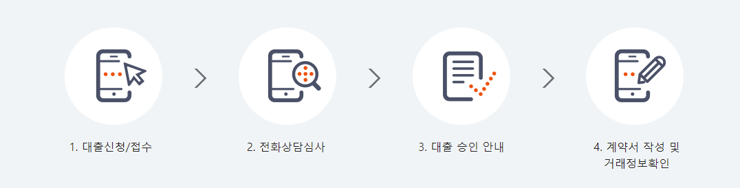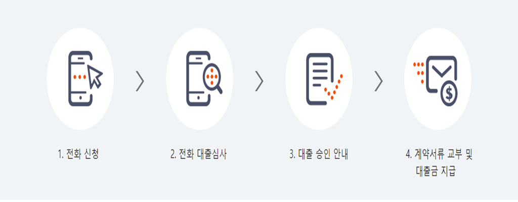 전화 대출은 전문 상담원에게 궁금한 점을 직접 물어볼 수 있어서 좋은데 절차는 전화 신청 후 전화 대출 심사 대출 승인 안내 그리고 계약서류 발부 및 대출금 지급입니다.