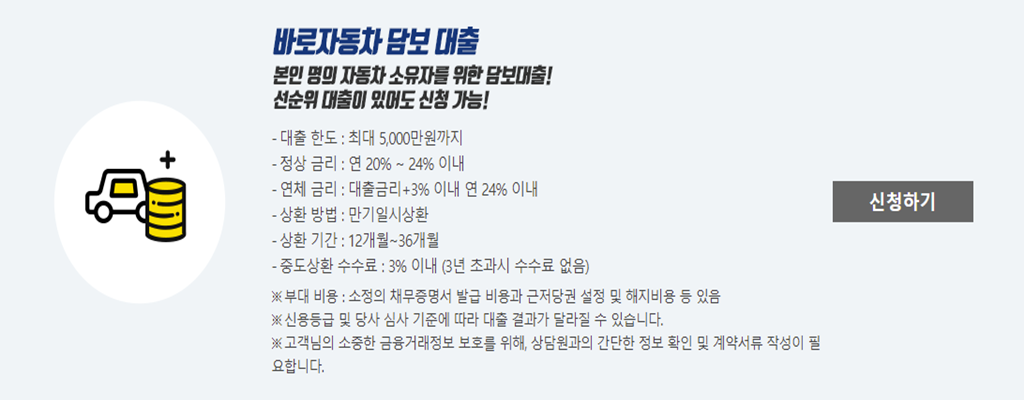 바로바로론 자동차 담보 대출은 최대 5000만 원까지 지원이 가능하며 연 20%에서 24% 이내 연체 그리는 3% 이내 24% 이내입니다. 상환 방법은 만기일시 상환 상환 기간은 12개월에서 36개월입니다. 중도상환 수수료는 3% 이내이니 도움 되시기를 바랍니다.