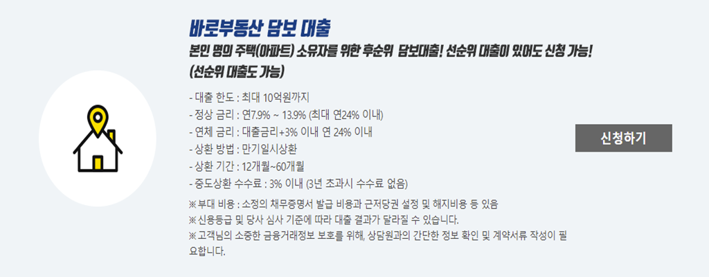 바로바로론 담보 대출은 부동산값이 급격하게 오려고 대출 규제가 많아지면서 담보 대출을 알아보시는 분이 많은 거로 알고 있습니다. 바로 부동산 담보 대출은 본인 명의 주택과 아파트를 소유한 분들을 위한 뒷순위 담보대출로서 선순위 대출이 있어도 신청이 가능합니다. 대출 한도는 최대 10억까지이며 정상 금리는 연 7.9%에서 13.9%입니다. 연체 금리는 +3% 이내 연 24% 이내입니다. 상환은 만기일시 상환 상환 기간은 12개월에서 60개월입니다. 중도상환 수수료는 3% 이내이니 참고하시기를 바랍니다.